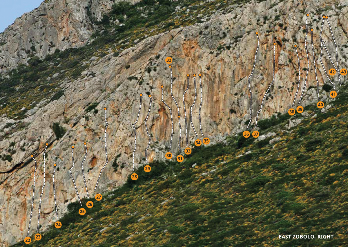 To ΔΥΤΙΚΟ ΖΟΜΠΟΛΟ είναι ένας εντυπωσιακός μεγάλος τοίχος με πολλές δυνατότητες για καλές διαδρομές. Προς το παρόν, έχουν εξοπλιστεί μόνο μερικές αξιόλογες διαδρομές.